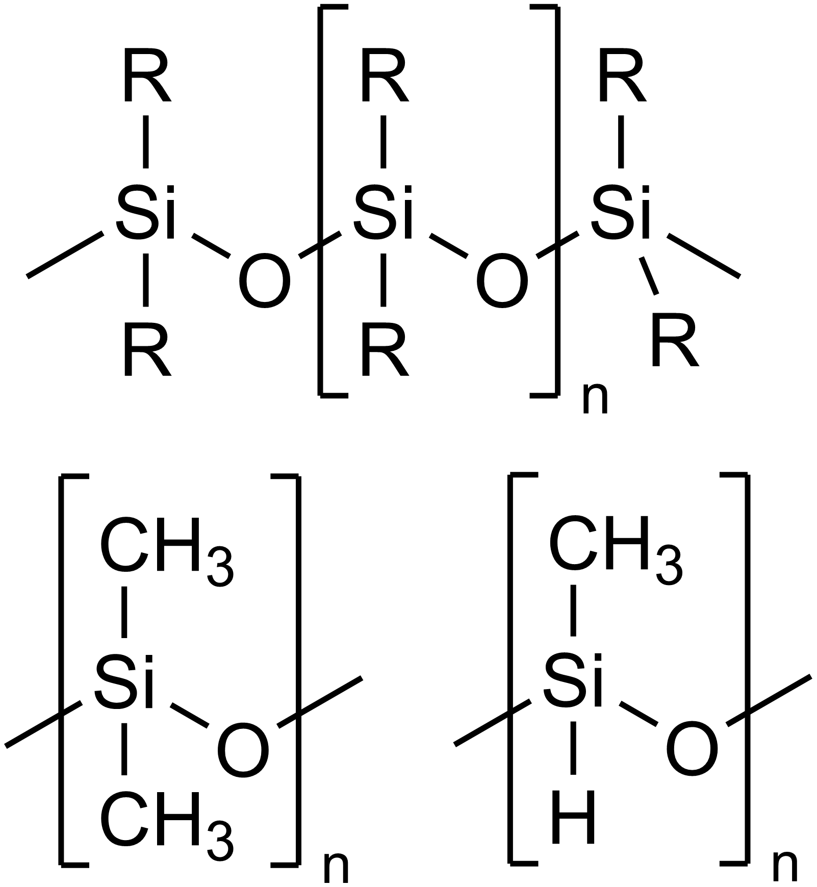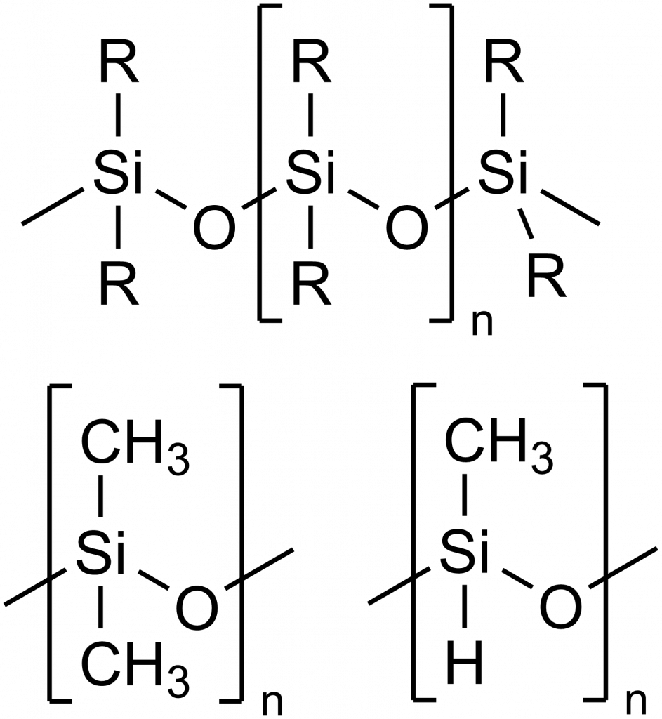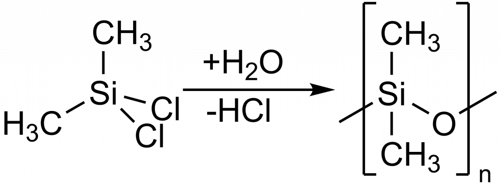 Nejběžnějším silikonem je polydimethylsiloxan (PDMS, viz obrázek výše), ten se připravuje hydrolýzou dimethyldichlorosilanu: