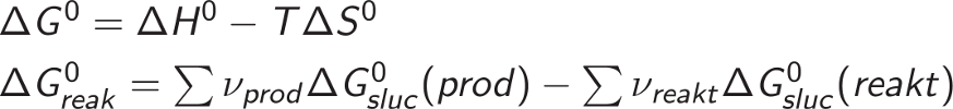 \Delta G^0_{reak} = \sum\nu_{prod}\Delta G^0_{sluc}(prod)\ – \sum\nu_{reakt}\Delta G^0_{sluc}(reakt)$$