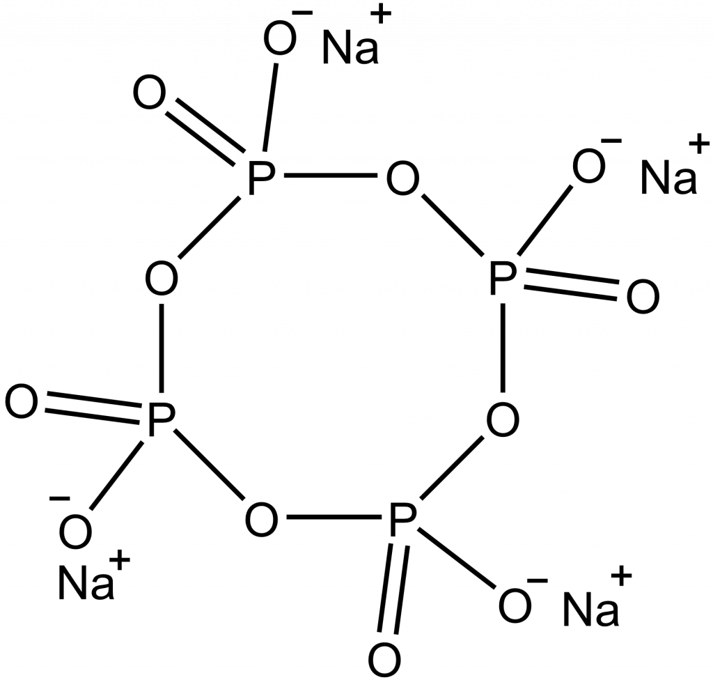 Velmi snadno spočítáme, že látka bude obsahovat čtyři jednotky, její vzorec tedy bude Na4P4O12. Jedná se o cyklo-tetrafosforečnan sodný, jeho strukturní vzorec je na obrázku níže.