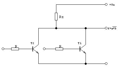 Tyto obvody jsou dnes již spíše historickou záležitostí. Zkratka RTL označuje tranzistorový logický obvod s odporovou vazbou (Resistor-Transistor-Logic). V zapojení uvedeném na obrázku dole se používá kladného napájecího napětí, takže při kladné logice bude obvod realizovat logickou funkci NOR. Při vstupní úrovni 0 budou oba tranzistory uzavřené a na výstupu bude úroveň 1. Otevřením alespoň jednoho tranzistoru (úroveň 1 na jeho vstupu) klesne výstupní napětí na úroveň 0.