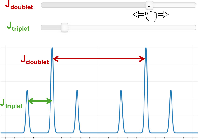- Dublets and triplets – ilustrace dubletu tripletu nebo tripletu dubletu, můžeme měnit chemický posun, jednotlivé interakční konstanty, rozšíření signálu (parametr Sigma) a intenzitu magnetického pole spektrometru.