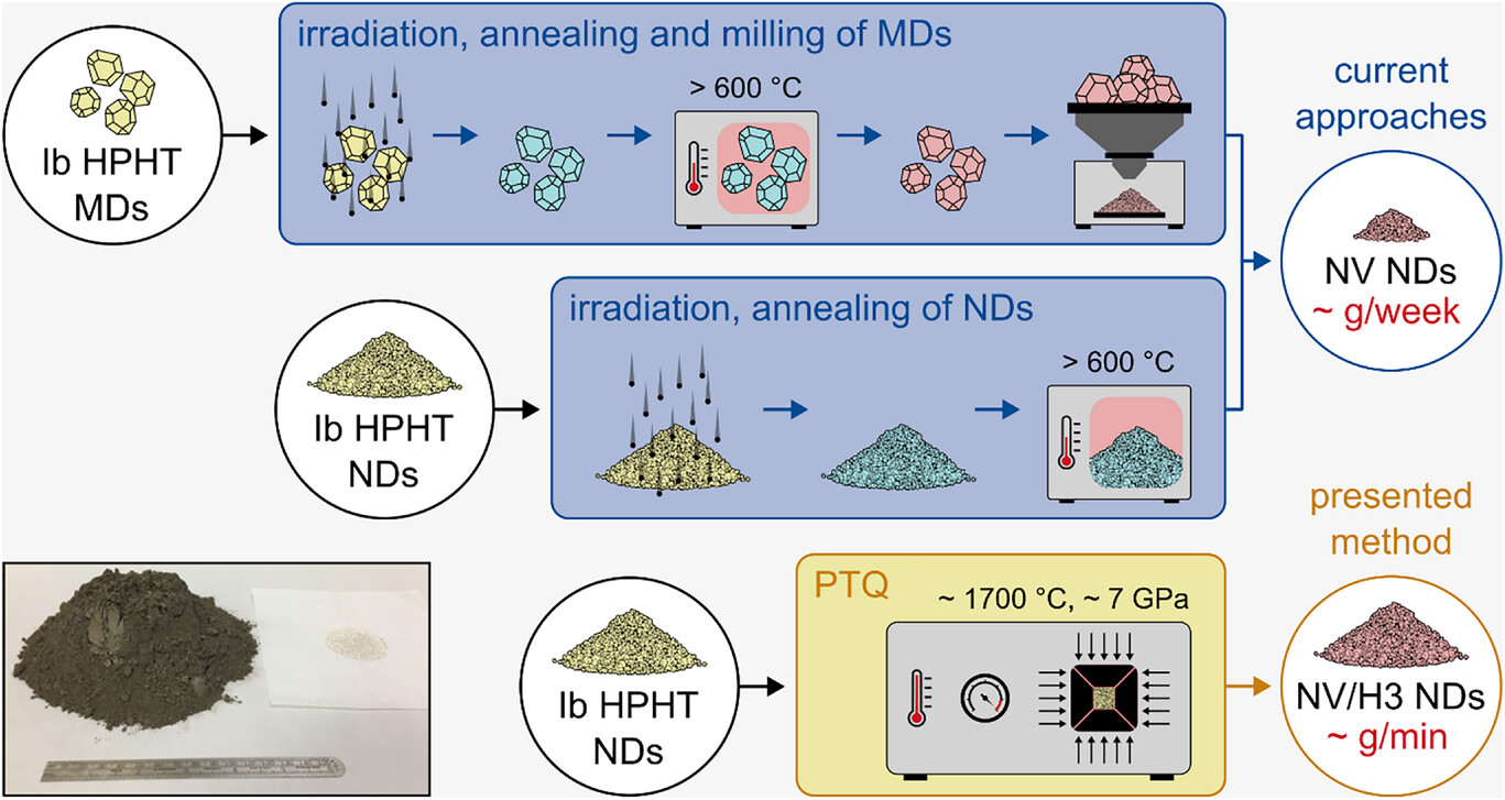 Fluorescenční nanodiamanty jsou velmi žádané, ale současné metody jejich přípravy neumožňují výrobu větších množství. Nanodiamanty je nutné dva týdny ozařovat svazkem nabitých částic, např. protonů nebo alfa částic a následně kalcinovat v peci.