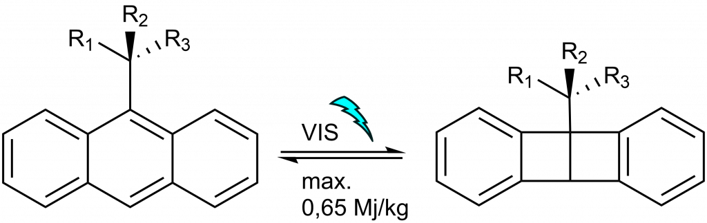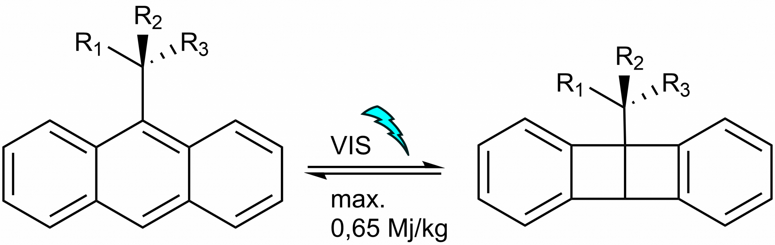 Po dopadu slunečního záření dochází k vratné izomeraci za vzniku tzv. Dewarova anthracenu. Tzn. že u prostředního cyklu dojde k přesunu π-elektronů za vzniku bicyklické struktury. Velice důležitý je fakt, že vzniklý izomer je stabilní po dostatečně dlouhou dobu, takže ho lze opravdu využít ke skladování energie. Uloženou energii pak uvolní ve formě tepla, jako impuls ke zpětné izomeraci lze využít zahřátí nebo ozáření systému.