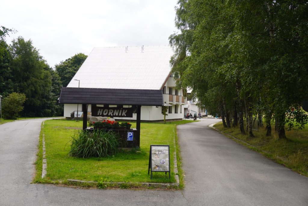 Od hejkala jsme šli kousek k hotelu Horník, kde je socha káněte, opět od Michala Olšiaka, tentokrát z roku 2013. Na rozdíl od Pepina je socha bez problémů přístupná. Od hotelu jsme se vrátili na zelenou značku a po ní jsme šli až k rybníku Medlov.