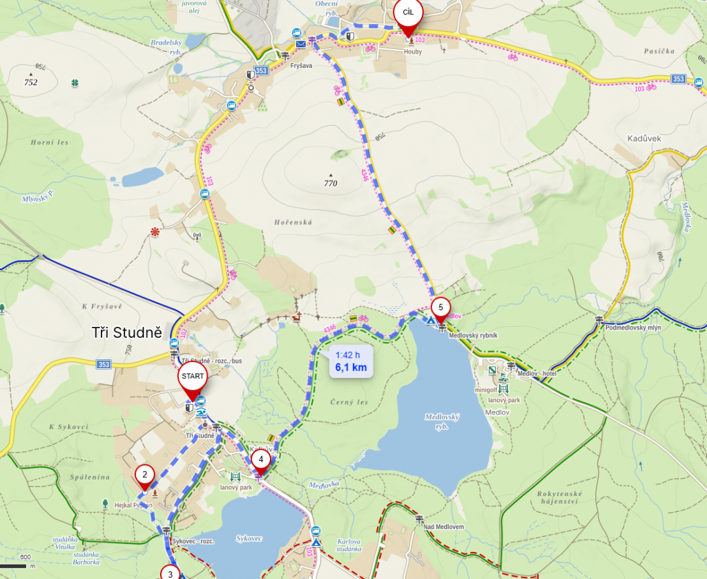 Od Medloveckého rybníka jsme přešli přes kopec (vrchol Hořenská 770 m n. m.) po žluté značce a dostali jsme se do Fryšavy. Ve Fryšavě jsme přišli k pomníku obětem 1. světové války a vydali jsme se po silnici k penzionu U Peňázů, zde je sousoší Houby a další dřevěné sochy.