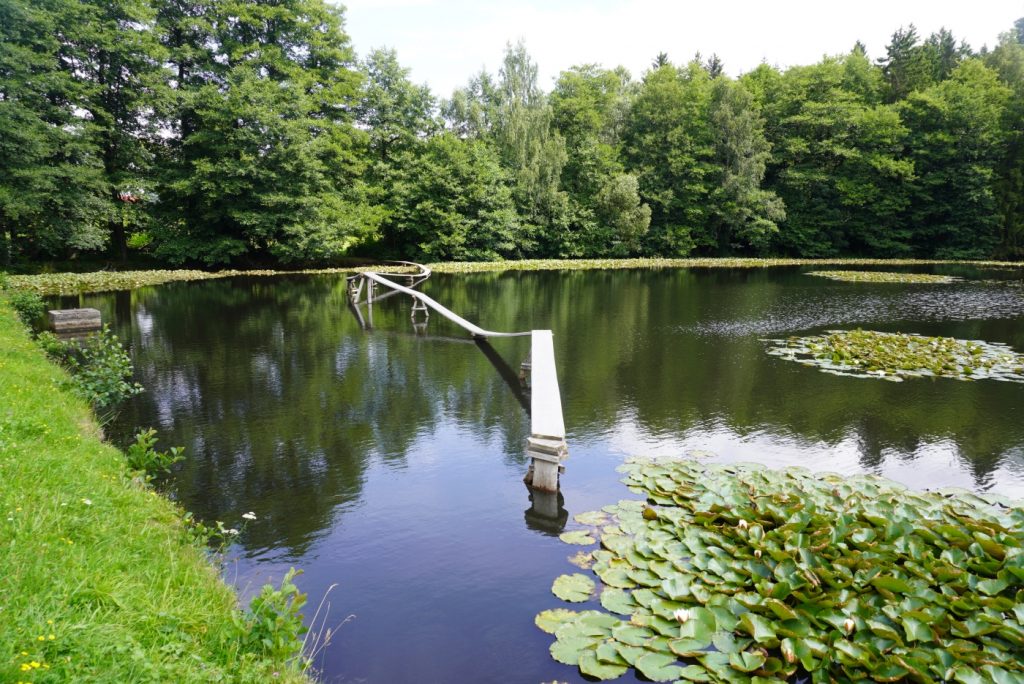 Při vstupu do Račína nás přivítala maketa policisty, zamířili jsme k rybníku Jordán, kde roste spousta leknínů a v roce 2007 zde byli po letech opět vysazeni raci. Přes rybník vede i lávka, která se využívá k akci Račínská lávka. Na břehu rybníka je socha Raka z roku 2008.